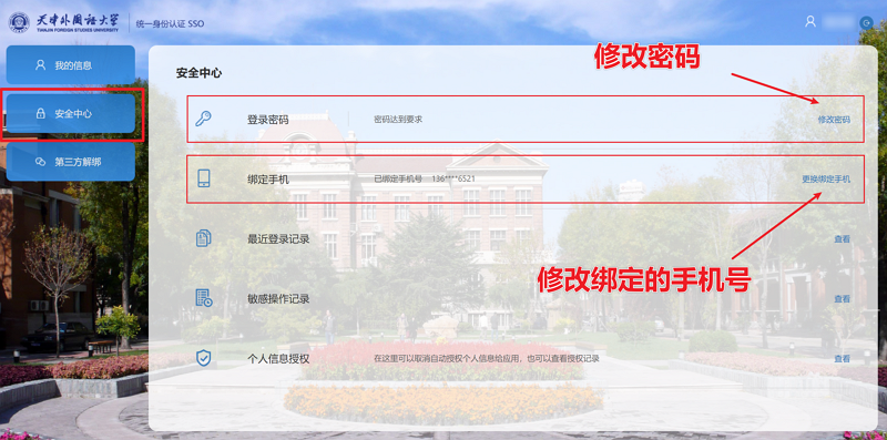 登录成功的用户,如需修改密码或修改绑定的手机号,可登录统一身份认证个人中心,在“安全中心”进行操作(如下图)。统一身份认证个人中心还可查看个人信息、查看登录记录等。